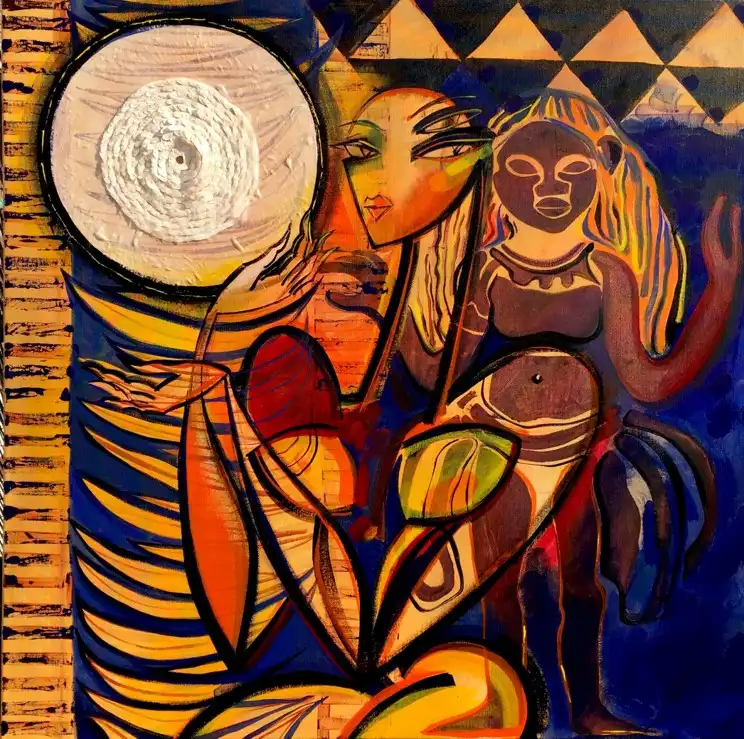 Akryl a výšivka na plátne